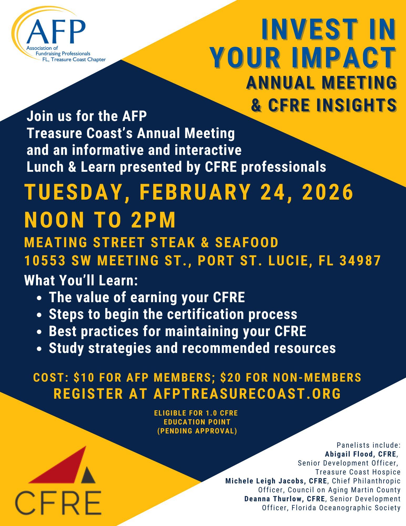 You can also support the work of AFP Treasure Coast by making a tax-deductible one-time donation or recurring donation by clicking the button above. Your gift will be used to provide education, networking, and scholarship opportunities to fundraising professionals in our area which helps to strengthen and support local non-profit organizations.